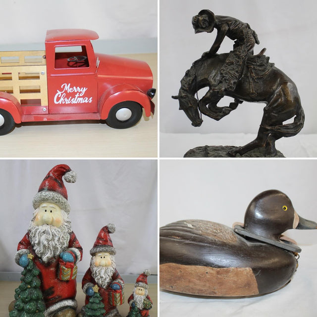 Bid on Antique and modern furniture, Limoges dinnerware, carnival glass fishing lures and reels, oil lamps, tin toys, cast iron banks, bronze sculptures, collection of metal military men, collection of decoys, wool blankets, enamelware, CN lanterns, unique canes, Daisy Air Rifles, Swords, Christmas Segment, 10kt & 14kt gold jewellery, costume jewellery, fur hats, large supply of RV accessories, tools, garden tools, trimmers, blowers, and so much more!!